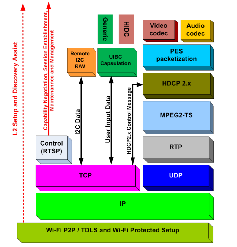 Miracast采用點對點Wi-FiDirect標準。它允許發送高達1080p高清視頻(H.264編解碼器)和5.1環繞聲(AAC和AC3是可選編解碼器,強制編解碼器是線性脈沖編碼調制–16位48kHz2通道)。連接是通過WPS創建的,因此使用WPA2進行保護。IPv4用于Internet層。在傳輸層上,使用TCP或UDP。在應用層,通過RTSP,RTP啟動和控制流以進行數據傳輸。