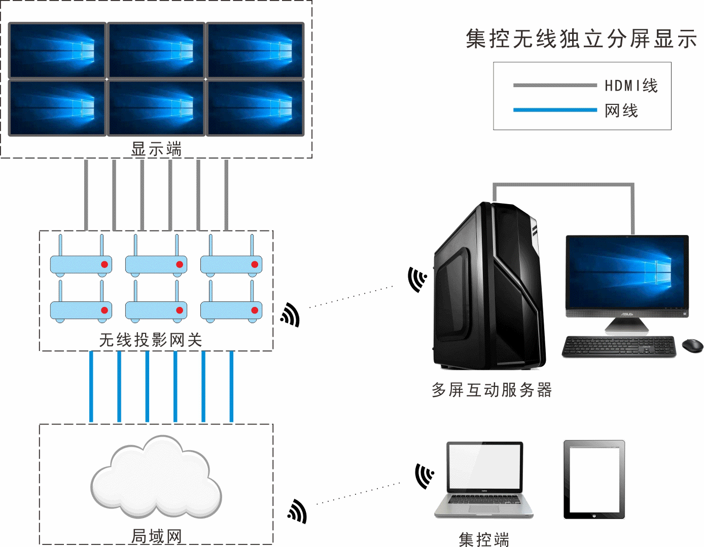 以上三種模式均可使用Awind集控軟件來控制局域網內的所有無線投影網關及每塊大屏的顯示情況。拓撲效果如下(可按住ctrl點擊圖片看動圖效果):