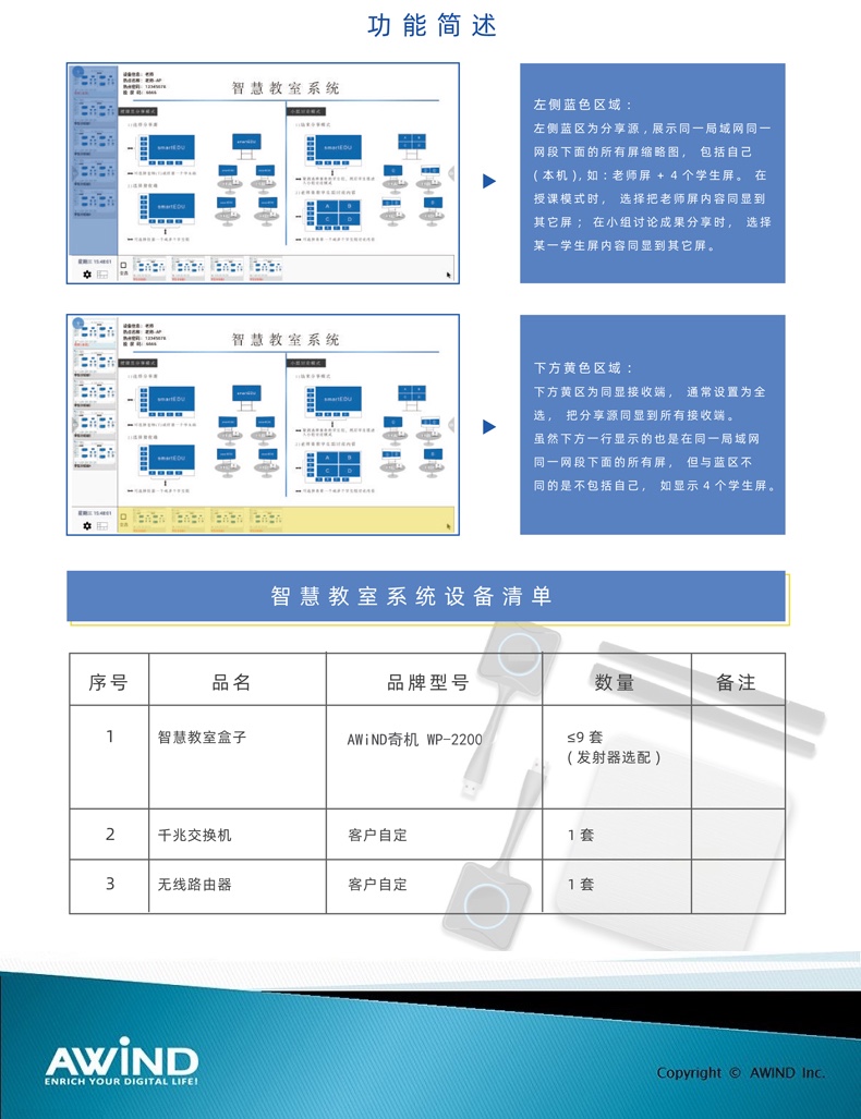每組學生討論組都是一樣的配置。每組學生端由一個65寸觸摸一體機或者電視機,配合一臺奇機Awind無線投影網關組成。Awind無線投影網關的HDMI輸出給電視機顯示。該組的學生使用PAD(華為平板)投屏至小組屏上進行討論。