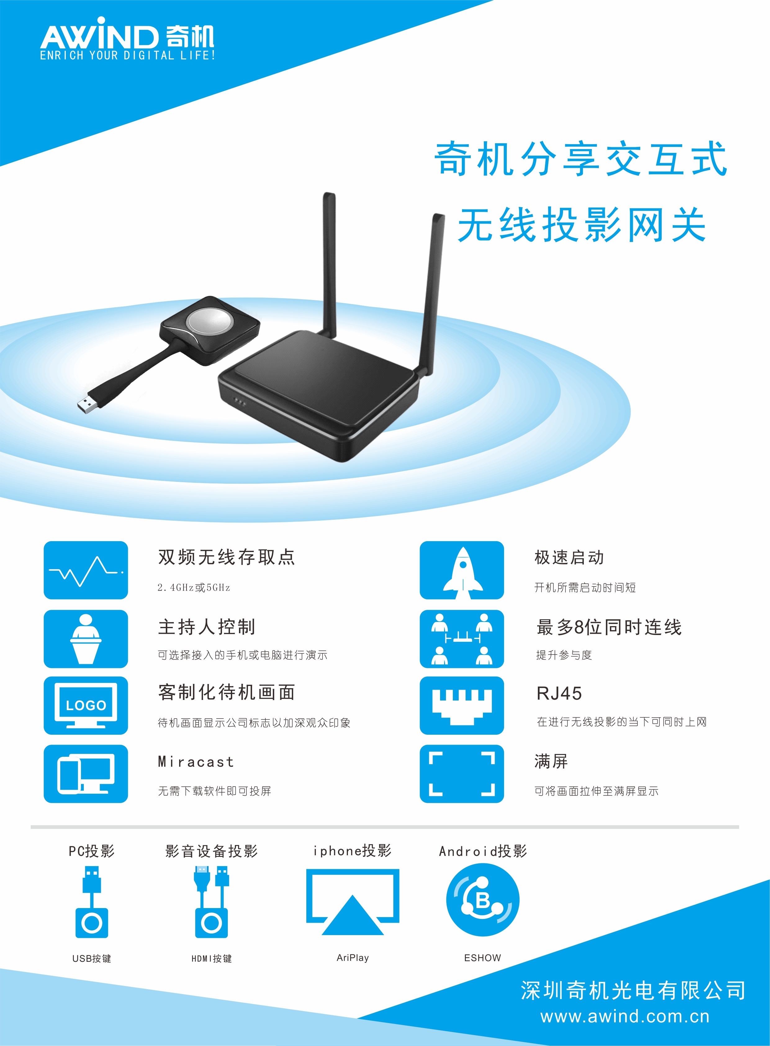 操作系統(tǒng) | Windows 7/8.1/10 32和64位 MAC OS X 10.10/10及以上 支持智能手機(jī)無線投屏 兼容airplay功能,推薦使用iOS9及以上 OS X 10.10及以上 支持miracast功能(無需切換主機(jī)WIFI配置) Android 5.0和更高版本(需安裝APP) |