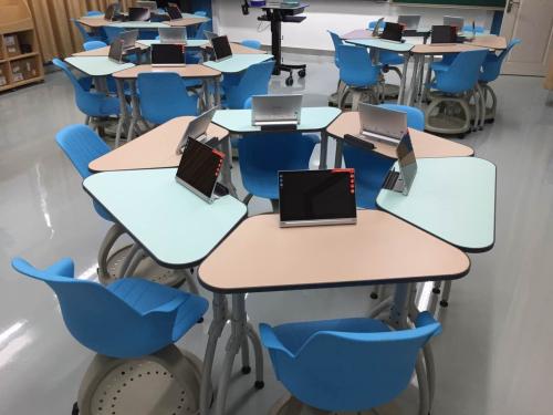 未來教室的開放性主要體現在兩個方面:教學空間的開放性和教學資源的開放性。傳統的教室空間以講臺為中心,學生座位整齊的排列在下方,座位比較固定。未來教室的空間設計會更加開放和多元化,多屏顯示使得學習空間得以延展,易于拼接的個性化桌椅能夠根據教學要求進行靈活的組織,方便學生迅速的組成學習小組,進行交流討論。