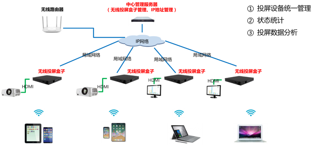 1、一臺投屏盒子連接一個投影儀(通過HDMI線/VGA線);
